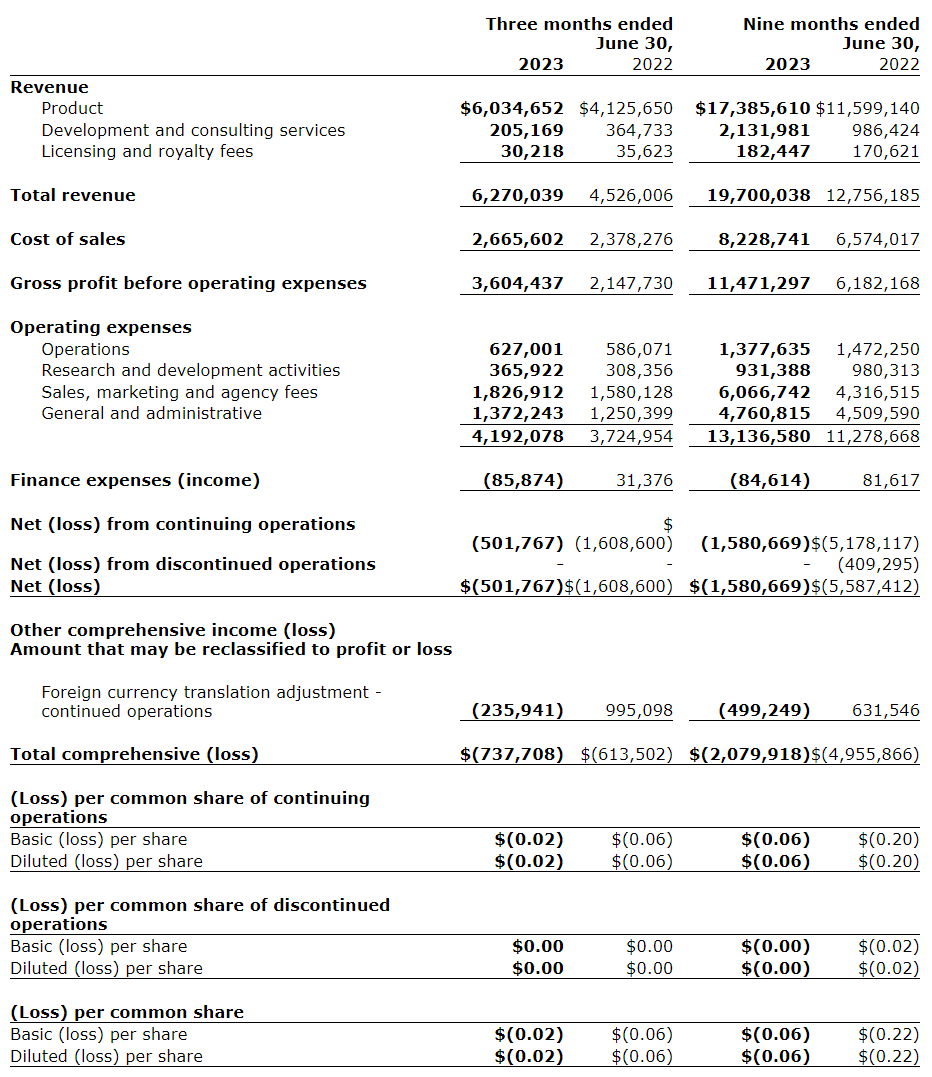 Gross margin for the nine months ended June 30, 2023, increased to 58 per cent, compared with 48 per cent in the same period for the prior year. During the nine months ended June 30, 2023, the company recorded inventory provision reversals resulting in a gain of $400,000, as a result of changes in obsolescence estimates, as compared with an inventory provision expense of $1-million being recorded during the nine months ended June 30, 2023.