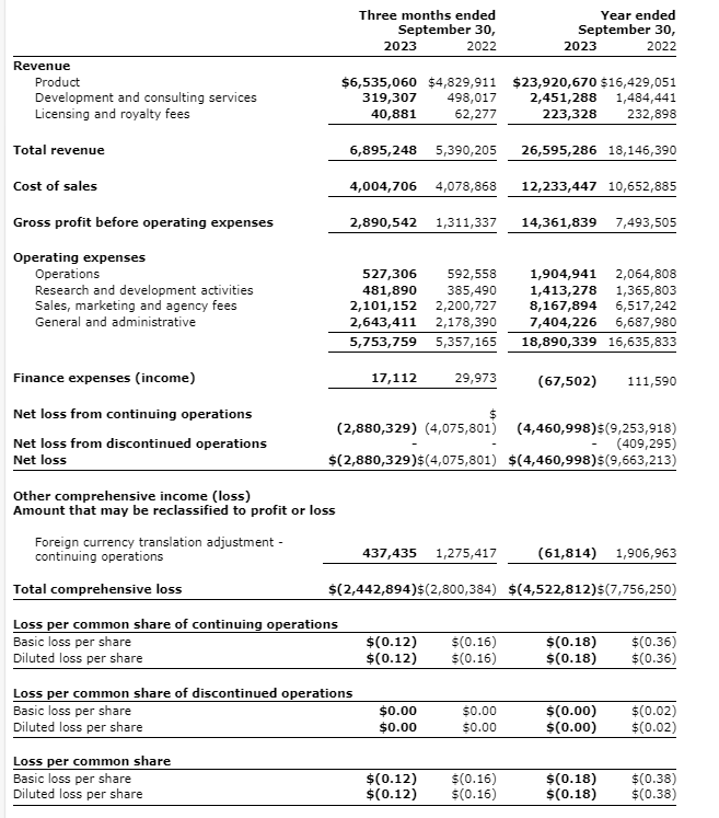 Gross margin for the year ended Sept. 30, 2023, increased to 54 per cent compared with 41 per cent in the same period for the prior year. During the year ended Sept. 30, 2023, the company recorded an inventory provision expense of $300,000 as a result of changes in obsolescence estimates, as compared with an inventory provision expense of $2.3M being recorded during the year ended Sept. 30, 2022. The gross margin is significantly influenced by source of revenue and by the relative mix of products sold in any given financial period.