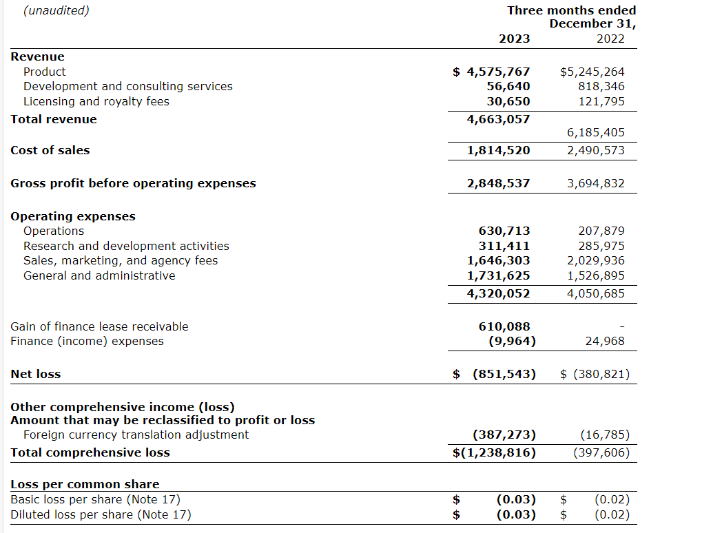 Operating expenses for the three months ended Dec. 31, 2023, increased $300,000 to $4.3-million, compared with $4.1-million for the prior year's comparative period. Approximately $400,000 relates to increased operations activities primarily due to an increase in staffing levels and product development expenses, this is offset with approximately $600,000 decrease related to the finance lease receivable for the sublease of a portion of Covalon's Seattle location.