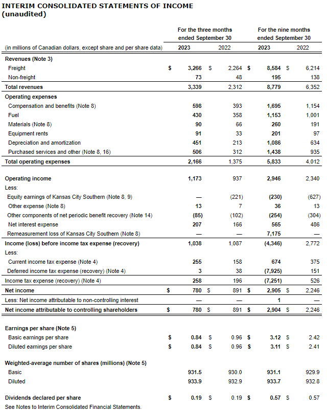 Canadian Pacific Kansas City Ltd. has released its third quarter results, including revenues of $3.3-billion, diluted earnings per share (EPS) of 84 cents and core adjusted combined diluted EPS of 92 cents.