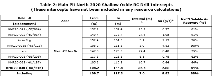 Resource expansion drilling at Main Pit North has intersected wide oxide gold intercepts at more that double the resource cut-off of 0.2 gram per tonne gold. The current results, in conjunction with prior drilling by the company during 2020, and by previous operators, define an emerging zone mineralization at Main Pit North extending 150 metres outside of the current resource pit shell. The results reaffirm the company's view that Main Pit North, in conjunction with the emerging Secret Spot target surface oxide discovery, is expected to be key oxide gold resource expansion drivers at Kinsley Mountain moving forward.