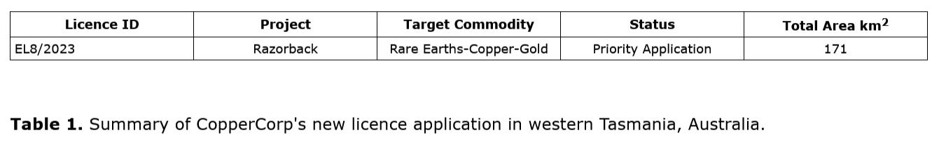 COPPERCORP AWARDED RAZORBACK REE AND CU-AU PROJECT IN TASMANIA, AUSTRALIA WITH HISTORICAL DRILLING INTERCEPTS OF 30.0M @ 2.1% TREO & 13.4M @ 1.6% CU AND 1.6 G/T AU