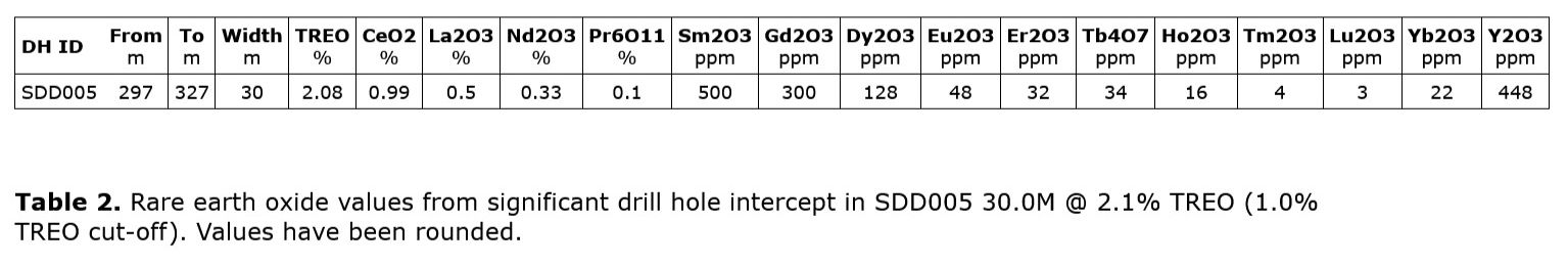 Excellent potential for rare earth element (REE) mineralization is also recognized with previous exploration drilling returning REE intercepts of 30.0m @ 2.1% TREO (drillhole SDD005)1, and anomalous REE's in surface rock chip sampling up to 16.2% TREO1 at the South Darwin prospect with limited follow-up exploration. The historical drilling results indicate that REE mineralization in the Razorback Project area is enriched in critical listed and valuable REE minerals including Neodymium (Nd), Praseodymium (Pr), Dysprosium (Dy), Yttrium (Y), Cerium (Ce), Lanthanum (La) (see Table 2).