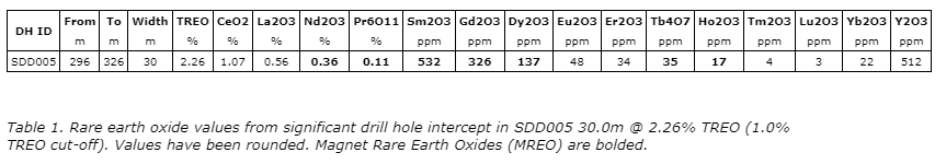 - SDD005:72.0 metres of 1.13 per cent total rare earth oxides (TREO) from 286m, including30.0 metres of 2.26 per cent TREO from 296m, including10.0 metres of 3.0 per cent TREO from 307m