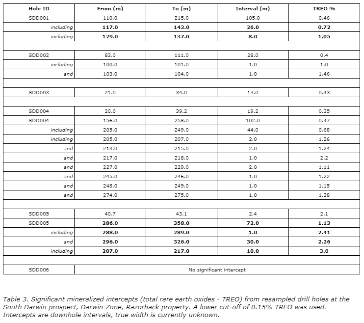 Significant widths of REE mineralization confirmed by resampling of historical drill core at Darwin prospect, with intercepts including: