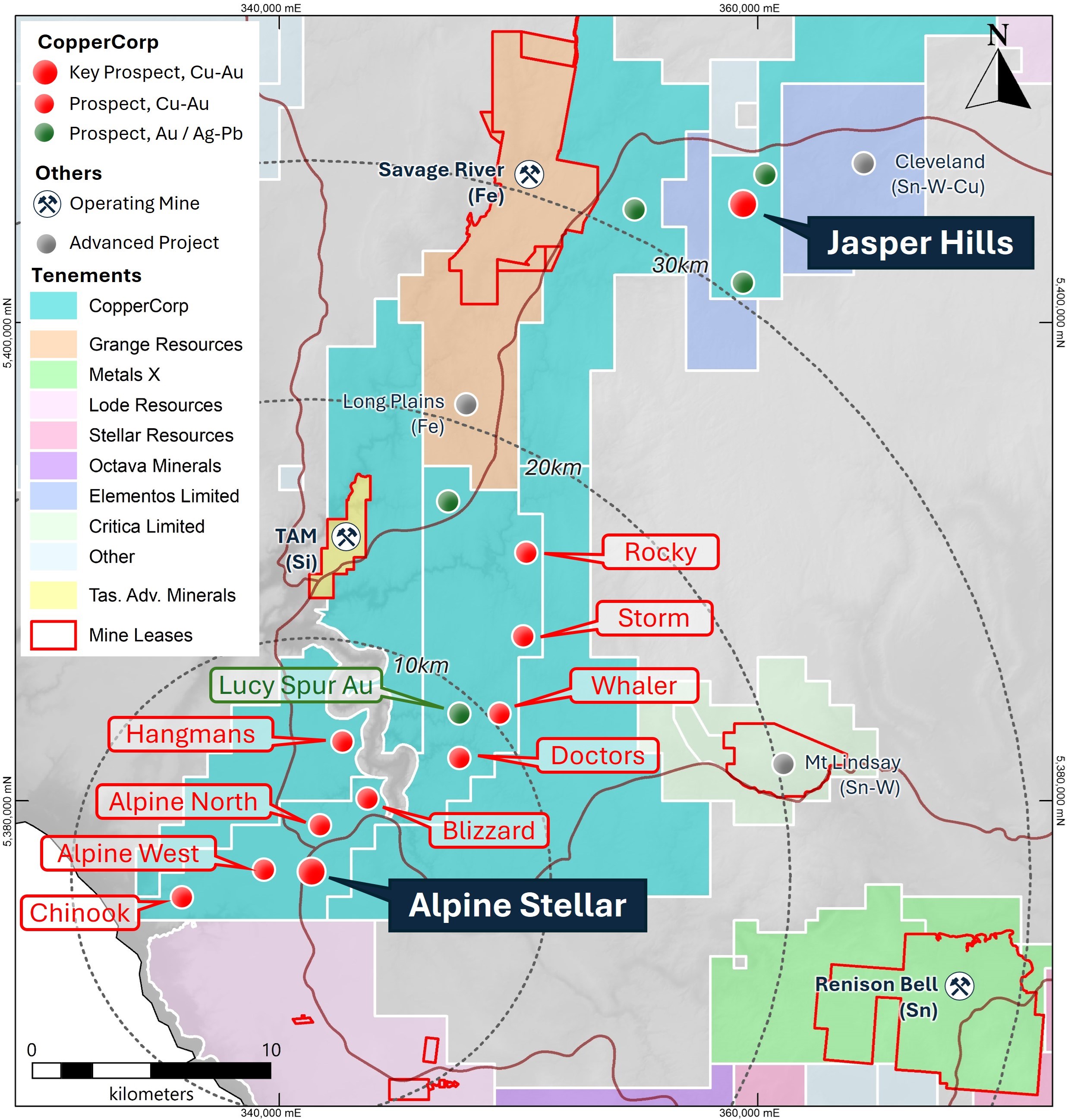 Figure 1. Map showing location of the Alpine Stellar and adjacent prospects in the Company's southern AMC Project area. Also shown are neighboring tenement holders (mostly ASX listed), and the location of operating mines and other development projects in the district.
