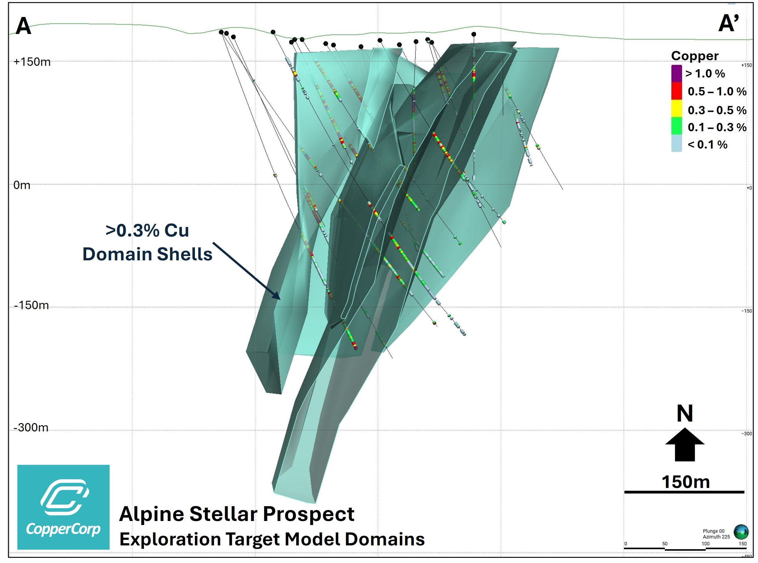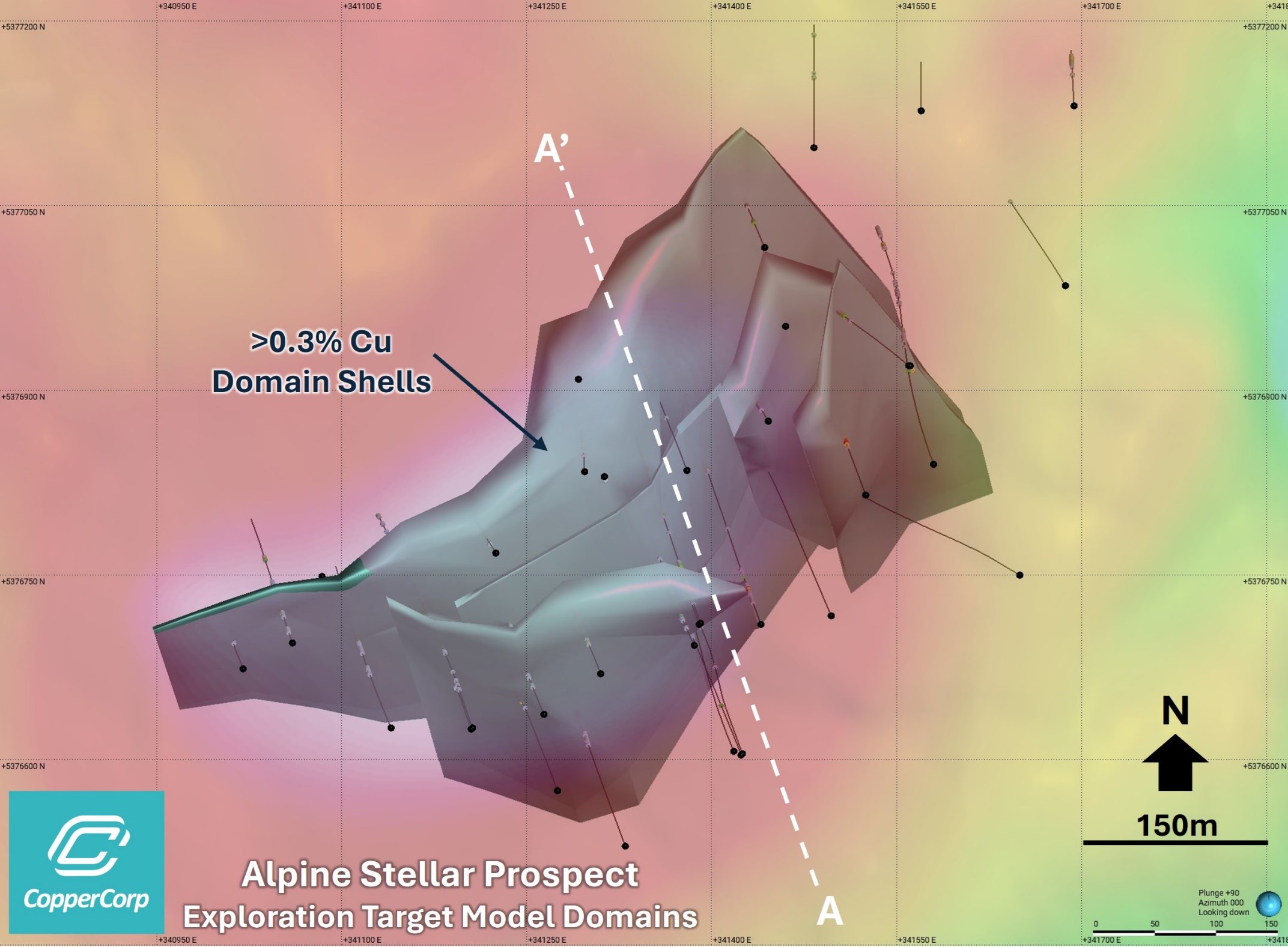 Figure 3. 3D oblique view (looking southwest through section line A-A' on Figure 2) showing Alpine Stellar zone Exploration Target domain shells (>0.3% Cu domains) and existing drill holes. Interpreted mineralized domains based on current drilling. Not a Mineral Resource.