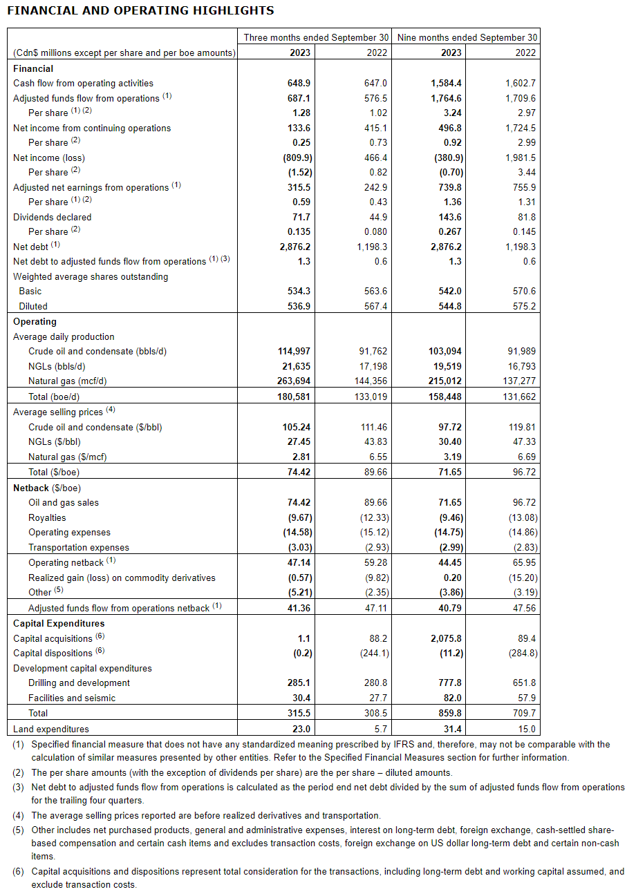 Adjusted funds flow totalled $687.1-million during Q3 2023, or $1.28 per share diluted, driven by a strong operating netback of $47.14 per boe.
