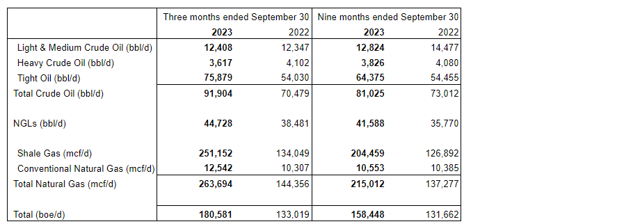The company's aggregate average production for the three months ended Sept. 30, 2023, and Sept. 30, 2022, and the references to natural gas and crude oil reported in this press release consist of the product types shown in the associated table, as defined in National Instrument 51-101, and using a conversion ratio of six mcf (thousand cubic feet): one bbl where applicable.