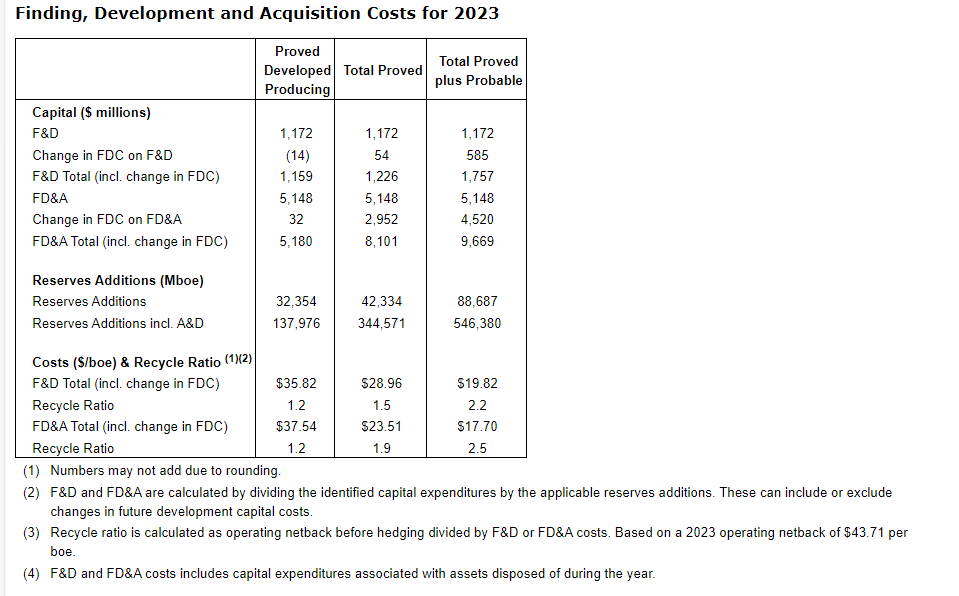 Generated a strong FD&A (finding, development and acquisition) recycle ratio of 2.5 times in 2023, including change in FDC (future development capital), based on 2P reserves;