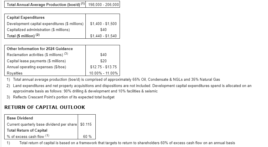 Crescent Point's board of directors has approved and declared a first quarter 2024 base dividend of 11.5 cents per share, an increase of 15 per cent from the prior level. The base dividend is payable on April 1, 2024, to shareholders of record on March 15, 2024. This base dividend increase equates to an annualized base dividend of 46 cents per share.
