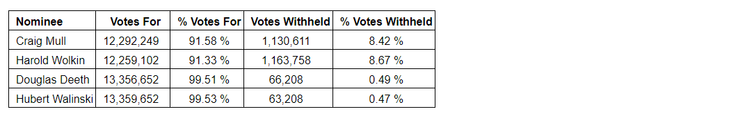 Craig Mull, the company's interim chief executive officer, wishes to thank Arthur M. Deboeck, Christian Godin and Cathy Steiner for their service to the company, and welcomes new directors Douglas Deeth and Dr. Hubert Walinski to the board.