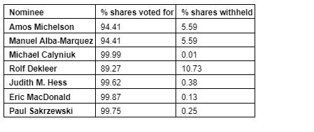 Final voting results of all matters voted on at the meeting will be made available on SEDAR.