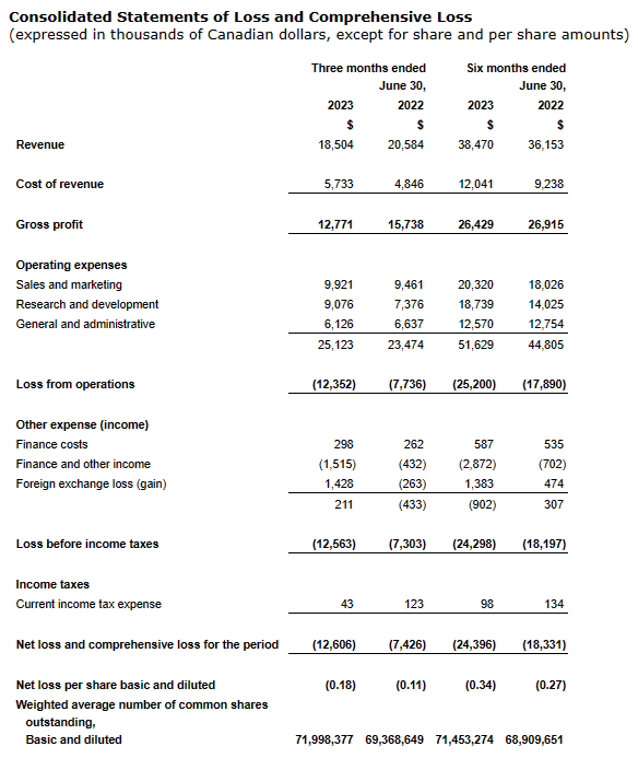 - Gross profit of $12.8 million representing a Gross margin of 69%, a 19% decrease from $15.7 million and a Gross margin of 76% in Q2 2022. Gross margin decreased temporarily primarily due to a decrease in perpetual and term-based software license revenue, an increase in subcontractor costs for the quarter, plus increased headcount and product support related to our growing client base.