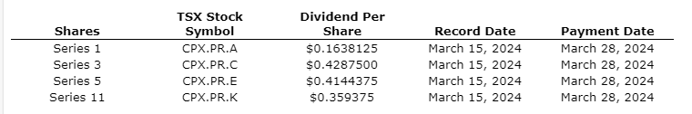 The board of directors for Capital Power Corp. has declared a dividend of 61.5 cents per share on the outstanding common shares for the quarter ending March 31, 2024. The dividend is payable on April 30, 2024, to shareholders of record at the close of business on March 28, 2024.