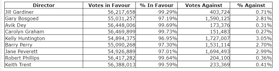 Each of the nine director nominees put forward by management was elected by a vote conducted by way of ballot.