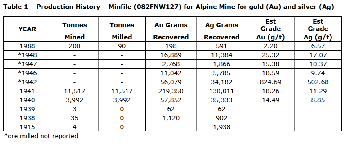 The 4,611.49-hectare property is approximately 20 kilometres northeast of the city of Nelson and hosts the former-operating underground mine with a recorded production of approximately 16,810 tonnes of mineralized vein material (Table 1). This material contained 356,360 grams of gold, 222,054 grams of silver, 49,329 kilograms of lead and 17,167 kilograms of zinc. The other four significant vein systems on the property will also be explored, including the Black Prince and Cold Blow quartz veins approximately three kilometres to the northeast of the Alpine mine, the Gold Crown vein system 600 metres southeast, and the past-producing King Solomon vein workings 1.8 kilometres to the south. Further information about the Alpine gold property will be forthcoming in the coming weeks.