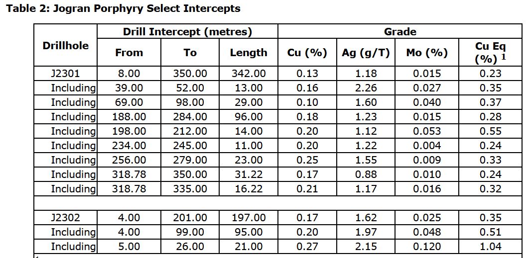 Two drill holes were completed at Jogran porphyry to test the extent and continuity of the mineralization encountered in previous historical exploration by Jogran Mines and Phelps-Dodge in the early 1960s. The Jogran porphyry is a quartz monzonite porphyry intrusion with a distinct alteration and mineralization style consistent with alkalic porphyry copper-molybdenum mineralization. Drilling has successfully confirmed the continuity of the copper and molybdenum mineralization in the porphyry over long intervals, beyond what was previously known laterally and at depth, and that the mineralization also extends to the southwest into the mafic volcanics where it is associated with localized and discrete potassic alteration (magnetite and biotite) occurring as haloes adjacent to quartz-carbonate veinlets and as local patches in the mafic volcanics.