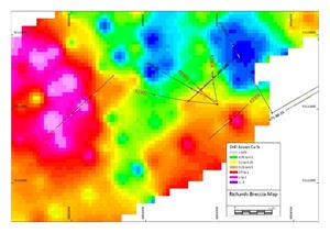 Richards Breccia is an altered polymictic and clast supported breccia. Clasts consist of altered volcanics, silicified cherty fragments and felsic intrusives. The presence of felsic intrusive clasts in the breccia indicates an emplacement related to an intrusive source at depth. Four (4) holes were drilled to test the continuity of the mineralization originally drill-tested by Aurogin Resources in 1997 and 1998, with an additional hole testing an area of high Gradient chargeability located approximately 200 metres to the west-northwest of Richards. Drilling successfully extended the breccia 50 to 60 metres vertically below the known mineralization, establishing the vertical extent of mineralization to 130 meters from surface. The breccia is still open at depth and is technically open to the northeast for at least a limited strike extent.
