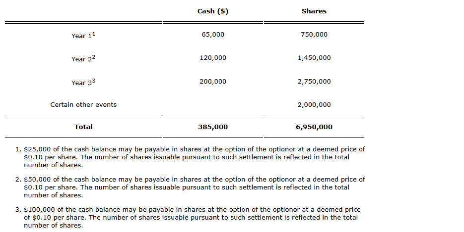 As previously announced on Dec. 8, 2025, the company has entered into four separate option agreements to acquire options to earn a 100-per-cent interest in 174 mining cell claims and 13 patented mining claims covering an area of approximately 10,232 hectares, located in Northeastern Ontario (the Ben Nevis project). The company has made initial aggregate milestone payments of $37,500 and 2.25 million common shares in connection with the acquisition of the Ben Nevis project with the payments shown in the attached table remaining.