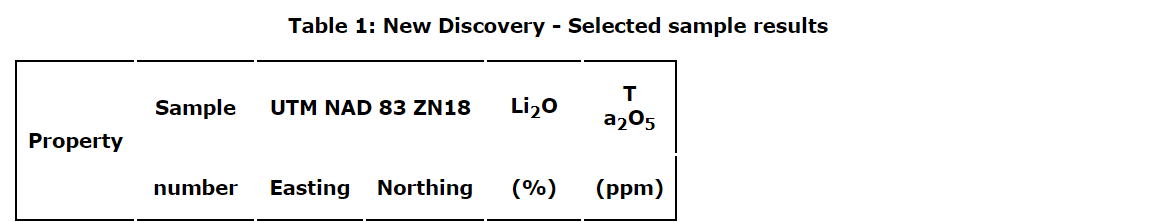 As reported on Sept. 12, 2023 (press release), several new outcrop discoveries have been identified in the Rose pegmatite swarm. To date, four spodumene-bearing pegmatite outcrops have been identified in this new discovery area. At this early stage, the exact strike length, width and orientations of these dikes is unknown, but the apparent strike length along the outcrops exceeds 400 metres. To date, the results from the initial 10 selected samples have been received. All samples are lithium bearing and 50 per cent of them report values over 3 per cent lithium oxide, with some results as high as 3.02 per cent Li2O, 3.62 per cent Li2O, 3.60 per cent Li2O, 3.37 per cent Li2O and 5.62 per cent Li2O (see an attached table). The reader is cautioned that grab samples are selective by nature and may not represent average grades of the mineralization in the pegmatites.
