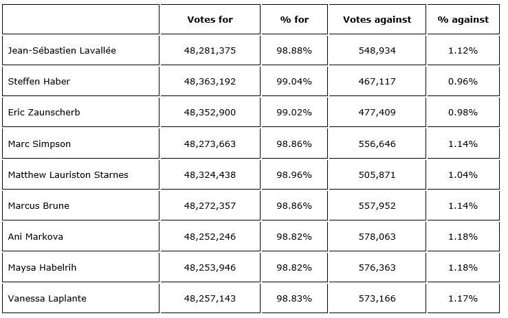 - Election of Jean-Sebastien Lavallee, Steffen Haber, Eric Zaunscherb, Marc Simpson, Matthew Lauriston Starnes, Marcus Brune, Ani Markova, Maysa Habelrih and Vanessa Laplante as directors;