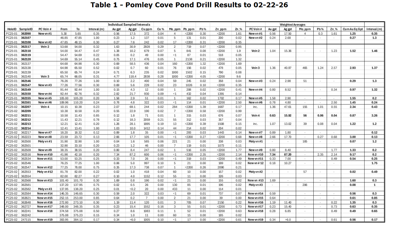 "The consistency in grade and polymetallic character of these drill results at Pomley Cove Pond align with previously reported surface trench results (see news release dated Jan. 5, 2026) and suggests continuity from surface to subsurface, and, most importantly, increasing molybdenum grades with depth within the central part of the peninsula (veins 3 and 4 plus others). Additionally, the polymetallic signature (Au-Ag-Mo-Pb-Zn-arsenopyrite) of this veining is typical of orogenic gold systems and intrusion related polymetallic veins in highly prospective geologic terrains like central Newfoundland."