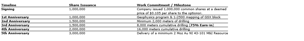 Under the terms of the LOI, Supreme has the right to earn up to a 100-per-cent interest in the Gator property in two stages over a five-year period through the issuance of 10 million common shares in the company and the completion of specific work commitments, as detailed in the attached table.