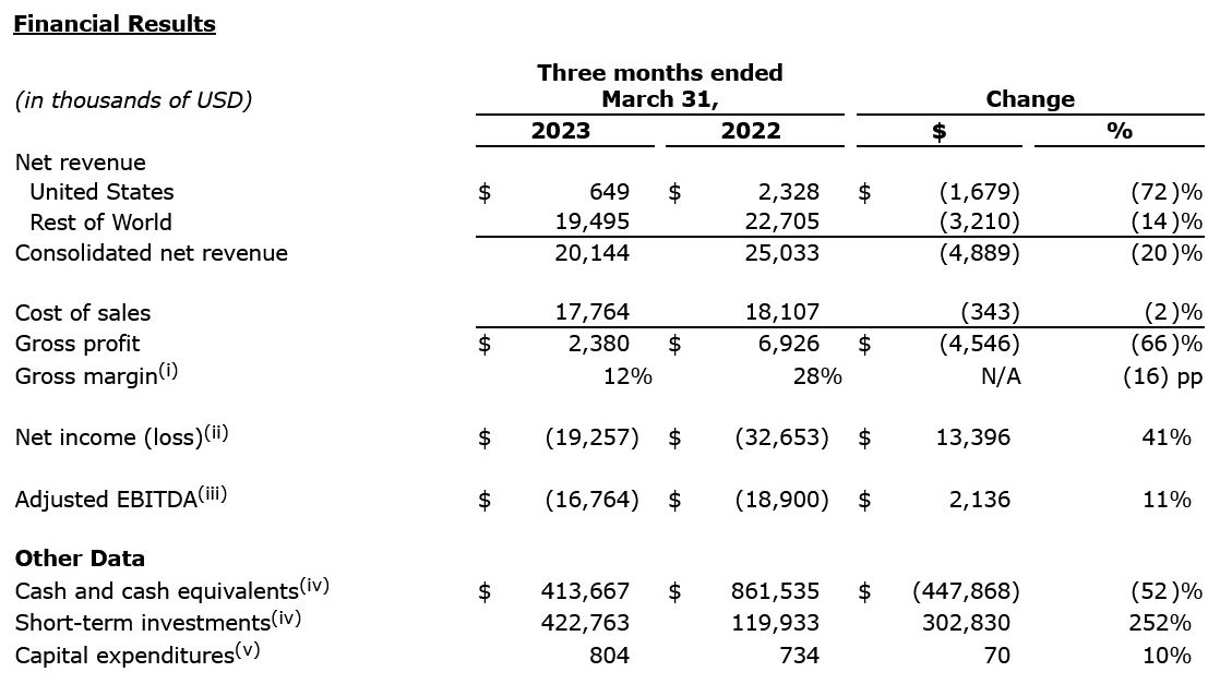 Net revenue of $19.5 million in Q1 2023 decreased by $3.2 million from Q1 2022. The decrease was primarily due to lower cannabis flower sales in Israel due to competitive activity, the slowdown in patient permit authorizations, and geopolitical unrest. Net revenue in Canada was impacted by adverse price/mix in the flower category driving increased excise tax payments as a percent of revenue, and increased returns. The weakened Canadian dollar and Israeli Shekel against the U.S. dollar also impacted ROW net revenue. Higher cannabis extract sales in Canada partially offset these results.
