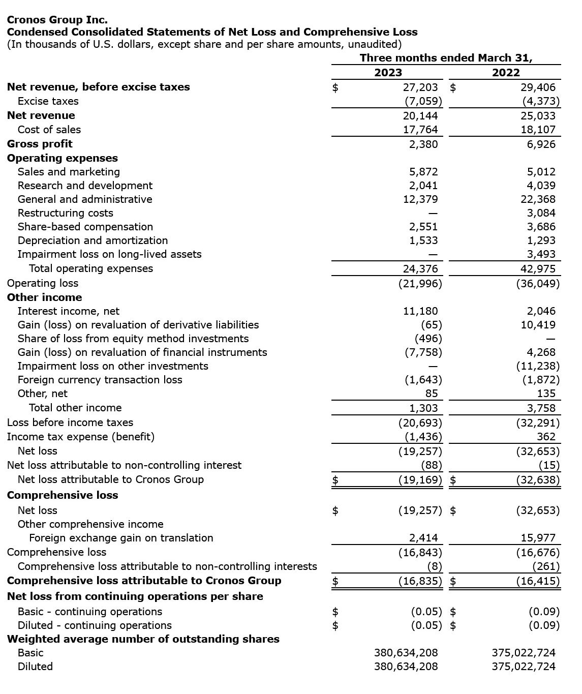 Cronos Group Inc. has released its 2023 first quarter business results.