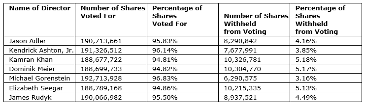 At Cronos Group Inc.'s annual meeting of shareholders held yesterday, June 22, 2023, shareholders holding a total of 247,410,987 common shares of the company voted in person or by proxy, representing 64.96 per cent of the total number of common shares of the company outstanding.