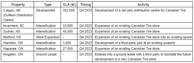 In 2023, CT REIT invested approximately $151 million in completed projects and ongoing developments and grew the portfolio by approximately 839,000 square feet of GLA. As of December 31, 2023, CT REIT had 571,000 square feet of GLA under development, of which approximately 98.8% is subject to committed lease agreements. These developments represent an investment of approximately $258 million upon completion, of which $86 million has been spent to date.