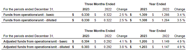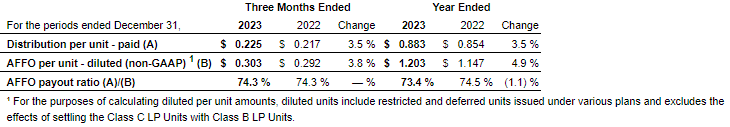 Adjusted Funds from Operations (AFFO)* - AFFO for the quarter was $71.5 million, which was $3.0 million or 4.3% higher than the same period in 2022, primarily due to the impact of NOI variances, partially offset by increased interest costs on the public debentures, and an increase in costs related to the Credit Facilities due to higher utilization and a higher rate of interest. AFFO per unit - diluted (non-GAAP) for the quarter was $0.303, which was $0.011 or 3.8% higher, compared to the same period in 2022, due to the growth of AFFO exceeding the growth in the weighted average units outstanding - diluted (non-GAAP).