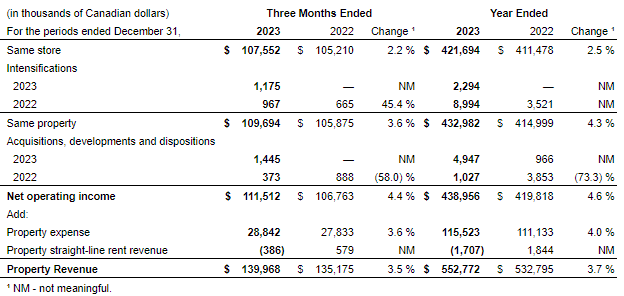 Net Operating Income (NOI)* - Total property revenue for the quarter was $140.0 million, which was $4.8 million or 3.5% higher compared to the same period in the prior year. In the fourth quarter, NOI was $111.5 million, which was $4.7 million or 4.4% higher compared to the same period in the prior year. This was primarily due to rent escalations from Canadian Tire leases, which contributed $1.6 million, and the intensifications of income-producing properties completed in 2022 and 2023, which contributed a further $1.5 million to NOI growth. The recovery of capital expenditures and interest earned on the unrecovered balance also contributed $0.9 million to NOI growth in the quarter.