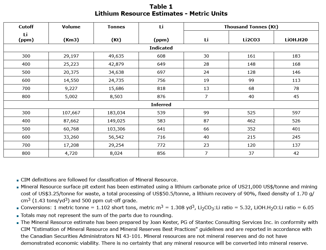 Stantec's base-case MRE at a 500 ppm cut-off grade is 35 million tonnes at 697 ppm Li for 128,000 indicated tonnes of LCE and 103 million tonnes at 641 ppm Li for 352,000 inferred tonnes of LCE. The mineral resource estimate has been prepared by Joan Kester, PGeo, of Stantec Consulting Services Ltd. in conformity with CIM (Canadian Institute of Mining, Metallurgy and Petroleum)