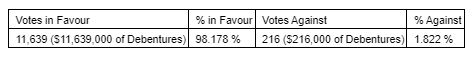 Debentureholders owning 59.275% of the outstanding Debentures voted. The detailed results of the vote were as follows: