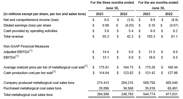 CORSA COAL ANNOUNCES FINANCIAL RESULTS FOR SECOND QUARTER 2023