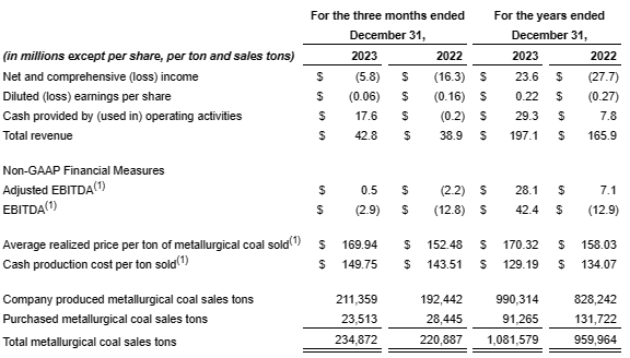CORSA COAL ANNOUNCES FINANCIAL RESULTS FOR FOURTH QUARTER AND FULL YEAR 2023
