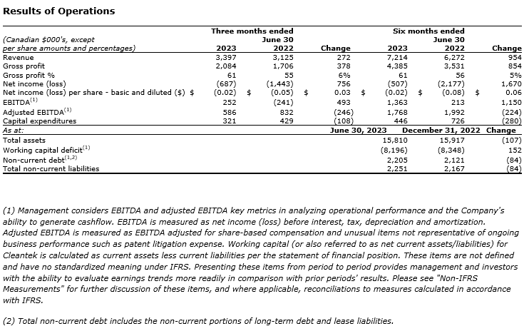 - Cleantek's gross profit of $2,084 or 61 per cent of revenue for Q2 2023 was in line with target and improved when compared with gross profit of $1,706 and 55 per cent of revenue for Q2 2022.
