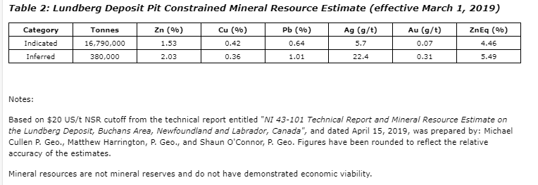 The total ore mined over the life of the historic Buchans mine is estimated to be 16 million tonnes at an average grade of 14.5 per cent Zn, 7.6 per cent Pb, 1.3 per cent Cu, 1.37 g/t Au and 126 g/t Ag. The current Lundberg deposit resource estimate is shown herein.