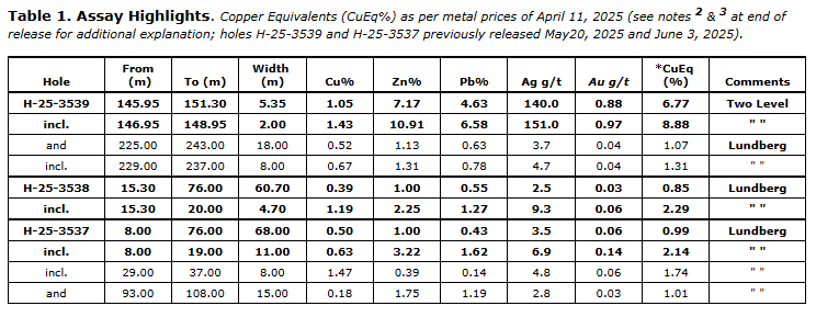 The latest drill results from hole H-25-3538 further demonstrate the robust and continuous mineralization of the Lundberg deposit. The standout 60.7-metre intersection grading 0.85 per cent copper equivalent, starting just 15.3 metres below surface, is one of the longest mineralized intercepts encountered to date and highlights the near-surface potential ideal for open-pit development. This builds on the previously announced 68-metre interval of 1.0 per cent copper equivalent from surface in hole H-25-3537 (June, 2025), reinforcing a consistent pattern of broad, high-grade mineralization near surface across the deposit.