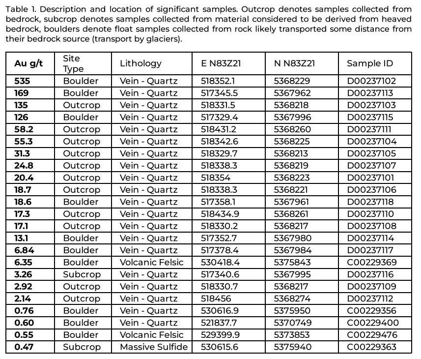 results, including 535 g/t, 169 g/t, 135 g/t and 126 g/t Au.