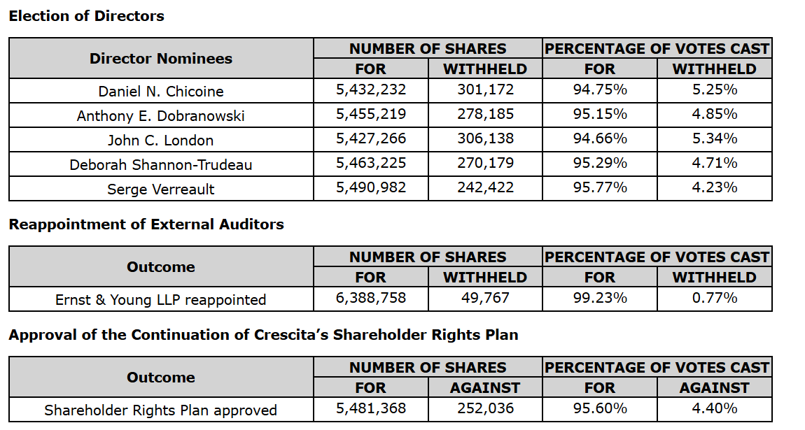 CRESCITA THERAPEUTICS ANNOUNCES THE RESULTS OF ITS ANNUAL GENERAL AND SPECIAL MEETING OF SHAREHOLDERS