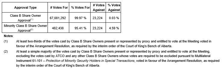 The meeting was held on Dec. 14, 2023. The total number of Class B shares represented by Class B share owners at the meeting and by proxy was 67,104,516, representing 98.16 per cent of the outstanding Class B shares. The votes by ballot on the special resolution to approve the arrangement were received as set out in the attached table.