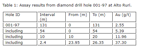 The Alto Ruri prospect was drill tested by Compania de Minas Buenaventura in 1997 who completed a two-stage, 12-hole drill program that included eight NQ core and a four reverse circulation (RC) drill holes totalling 2,254.5 metres. GlobeTrotters' then subsidiary, Rio Maranon Minerals SAC, reanalyzed portions of the core from the eight diamond drill holes in 2011 with hole 001-97 returning significant Au values averaging 2.55 grams per tonne Au over 131 m starting from surface, including 54 m of 5.39 g/t Au. The Au mineralization is associated with the vuggy silica replacement of quartz-clay altered volcanoclastic rocks typical of high sulphidation epithermal Au alteration but true widths are unknown.