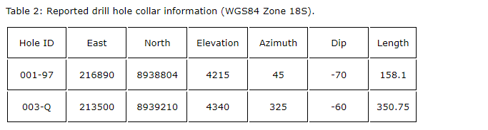 The original source of the historical assay results in RC drill hole 003-Q is from a 2011 technical report prepared by Rio Maranon. The information suggests that porphyry Au-Cu-Mo mineralization may be present in this area. The rock chip and geochemical sample reject materials from 003-Q are no longer available for reassaying purposes. For that reasons, the historical Au assay results from RC drill hole 003-Q have not been verified by the company.