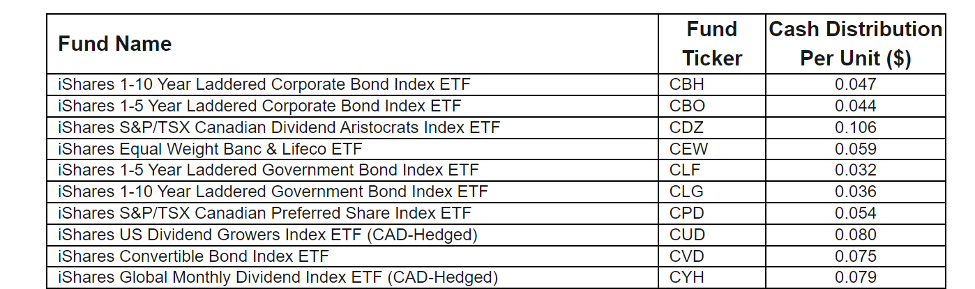 BlackRock Asset Management Canada Ltd. has declared November, 2023, cash distributions for the iShares exchange-traded funds listed on the Toronto Stock Exchange or Cboe Canada which pay on a monthly basis, as well as iShares S&P/TSX 60 Index ETF and iShares Canadian Real Return Bond Index ETF. Unitholders of record of a fund, with the exception of iShares Canadian Real Return Bond Index, on Nov. 22, 2023, will receive a cash distribution payable in respect of that fund on Nov. 30, 2023. Unitholders of record of iShares Canadian Real Return Bond Index on Dec. 4, 2023, will receive a cash distribution on Dec. 7, 2023.