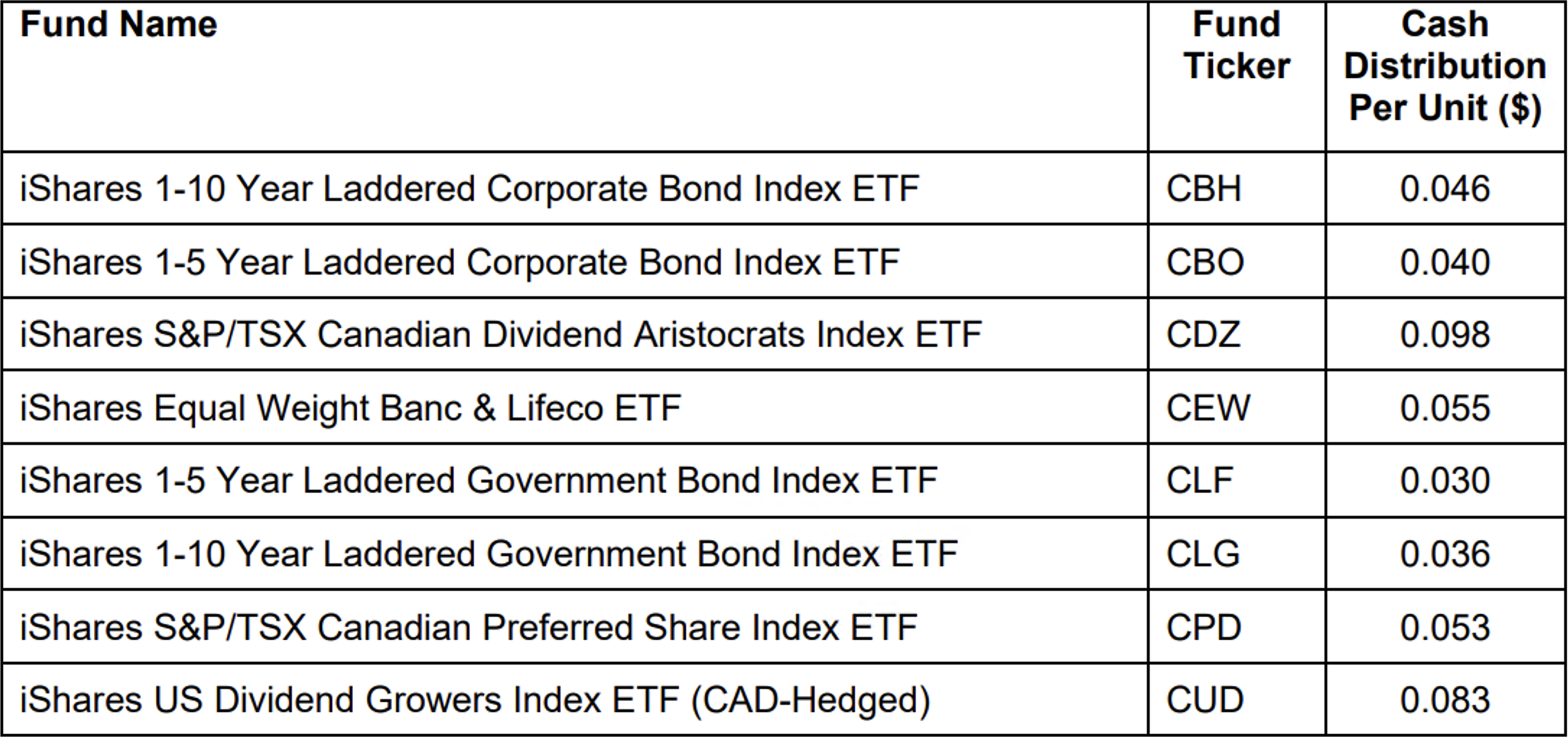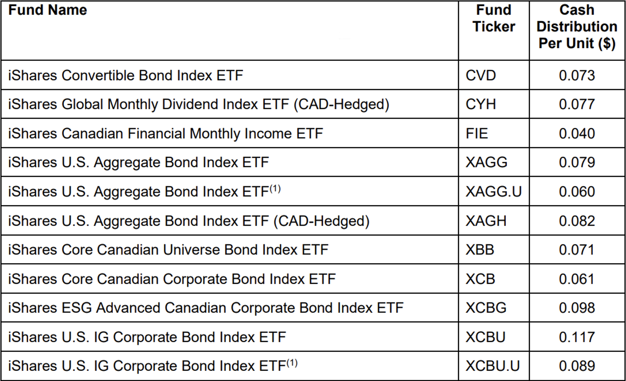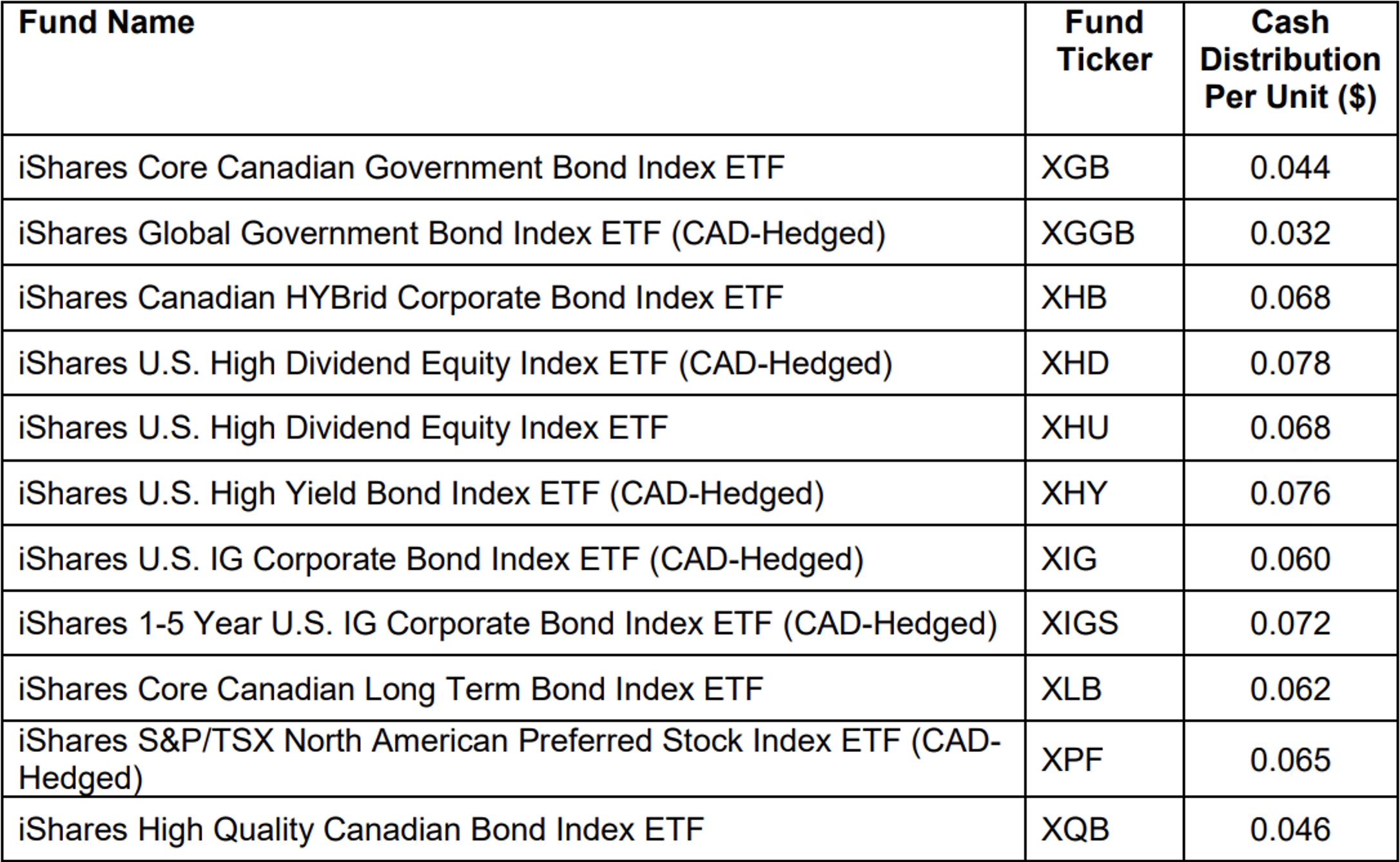 BlackRock Asset Management Canada Ltd. has declared the July, 2023, cash distributions for the iShares exchange-traded funds listed on the Toronto Stock Exchange or Cboe Canada which pay on a monthly basis. Unitholders of record of a fund on July 26, 2023, will receive a cash distribution payable in respect of that fund on July 31, 2023.