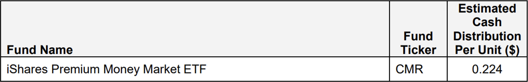 The April cash distribution per unit for iShares Premium Money Market is estimated in an attached table.