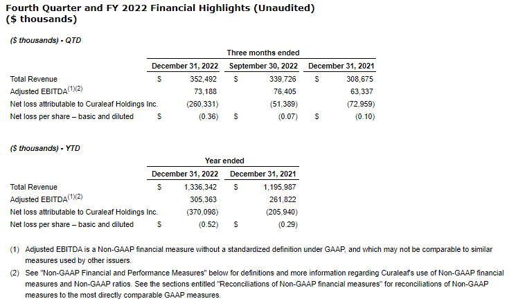 Curaleaf Holdings Inc. has released its financial and operating results for the fourth quarter and year ended Dec. 31, 2022. All financial information is reported in accordance with U.S. generally accepted accounting principles (GAAP) and is provided in U.S. dollars unless otherwise indicated.